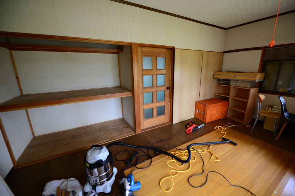 とりあえず、あまりにも荷物が多く、最初に始めたのが、要らないものの撤去と纏めるパッキング作業。エレクトーン、自転車、ベッド、バーカウンター、子供グッズ、スノボ、その他山ほどあった様々なものを纏めて空間を作りました。その後、押入れをトイレに改造したりして、宿として利用できる空間づくりを進めました。